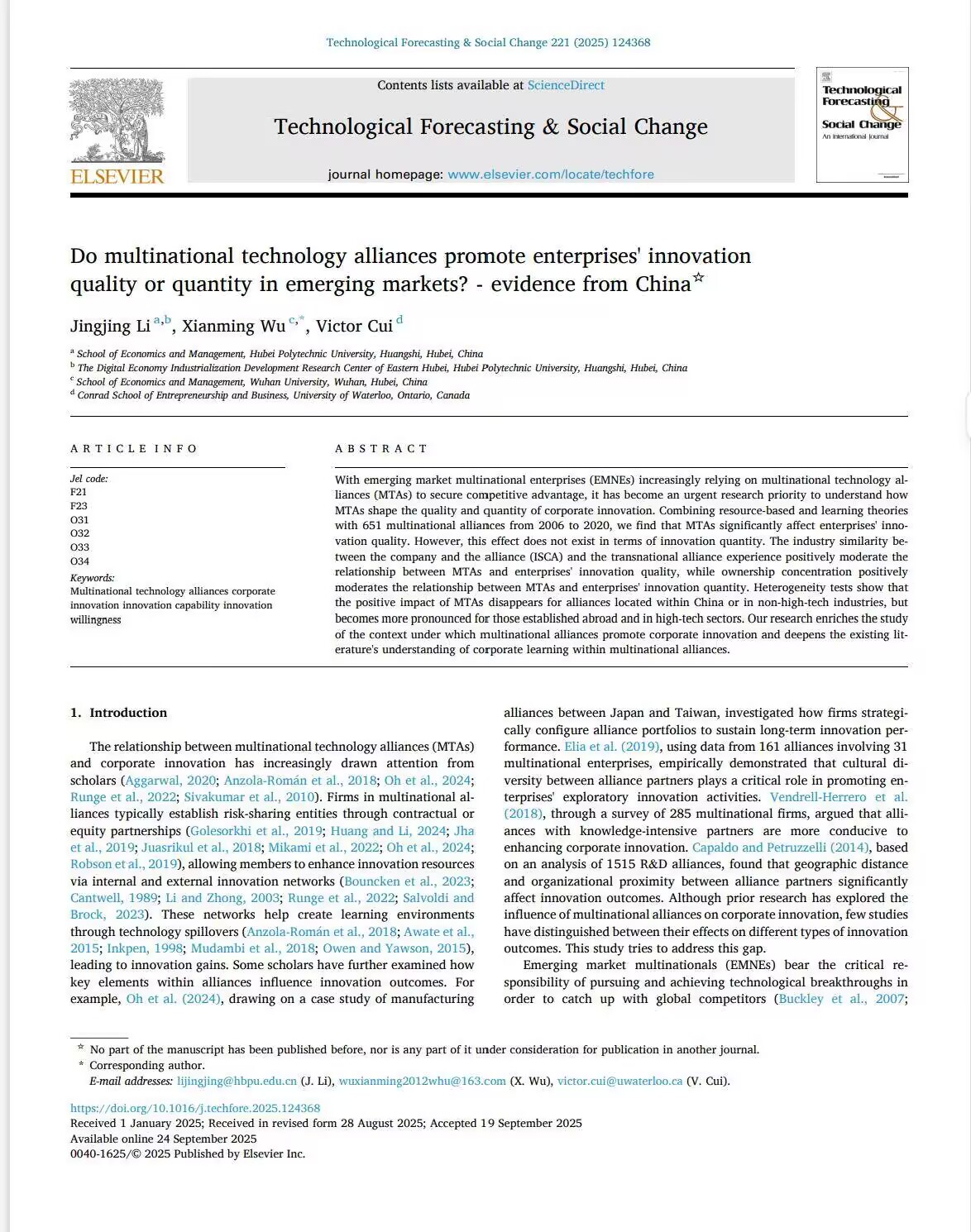 本网消息 近日,湖北理工学院经济与管理学院李京晶副教授的论文《Do multinational technology alliances promote enterprises' innovation quality or quantity in emerging markets?—Evidence from China》在国际顶级学术期刊Technological Forecasting & Social Change正式发表。该期刊为SSCI一区TOP期刊,在科技创新与战略管理领域具有重要国际影响力。这是湖北理工学院经济与管理学院首次在影响因子为13.3的一区顶刊发表学术论文,标志着湖北理工学院经济与管理学院在高水平科研成果产出方面实现了新的突破。