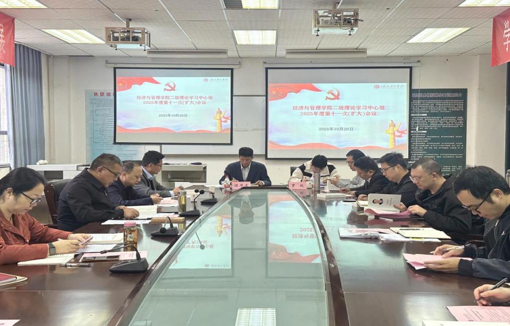 本网消息 10月20日下午,经济与管理学院在X3-210会议室召开二级理论学习中心组2025年度第十一次扩大会议,深入学习《习近平谈治国理政》第五卷,贯彻落实习近平总书记在中共中央政治局第二十二次集体学习讲话精神和《中国共产党思想政治工作条例》,筑牢学院思想政治防线。校党委旁听督导组——校纪委副书记、党委巡察办主任沈华东,校纪委综合室副主任科员罗政旁听督导。经济与管理学院班子成员及党总支部委员、师生党支部书记参加会议。会议由经济与管理学院党总支部书记胡卫东主持。
