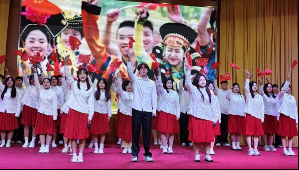 团员青年们带来的合唱节目《美丽中国》旋律动人,以嘹亮的歌声唱响了新时代青年的担当,展现了经济与管理学院学子团结奋进的精神风貌。舞台剧《觉醒年代》,生动再现了五四运动时期青年学子为国请命的历史场景,将那个风雨如晦年代中青年们的爱国赤诚与历史担当演绎得淋漓尽致,深深感染着大家。诗朗诵《石榴红·中国梦》,以饱含深情的语言,歌颂了中华民族多元一体的灿烂文化,诵读者声情并茂,将各族人民心手相连、守望相助的真挚情感娓娓道来。徐楚鹃同学表演的孔雀舞,以灵动的舞姿展现了少数民族能歌善舞的文化传统,绚丽的民族服饰和欢快的节奏瞬间点燃全场气氛。活动在全体观众深情合唱《我爱你中国》中落下帷幕,经管学子用真挚的歌声表达对祖国的热爱与祝福,将民族团结的主题升华到新的高度。