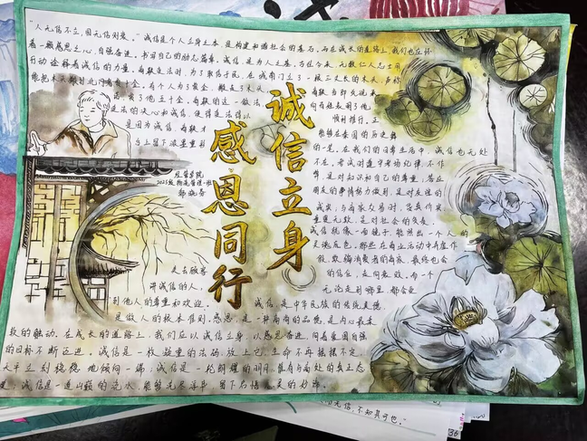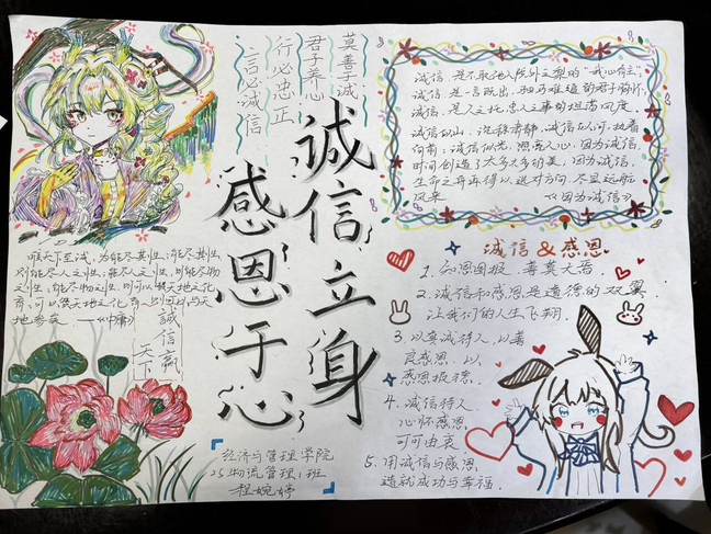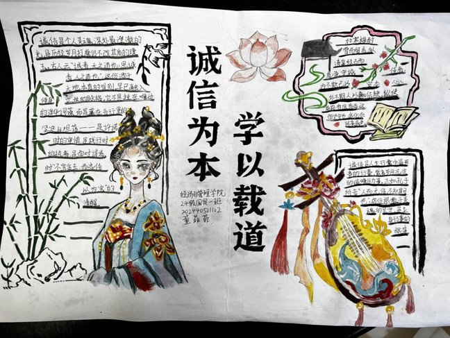 以艺载德,以美润心。本次活动既是才艺风采的展示,更以创作锚定传统美德的当代表达——同学们于纸笔间悟诚信感恩之价值,将“内化于心、外化于行”的理念落于实践,既展现经济与管理学院学子的创意风姿,更让崇德向善的风尚在院系间生长,为校园文化注入青春动能。