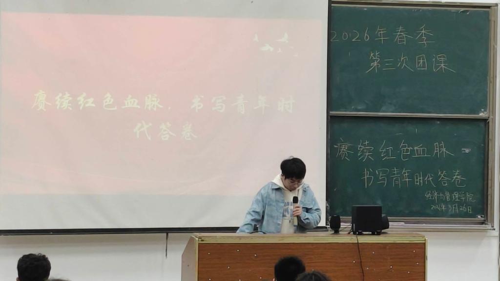 本网消息 为深入学习贯彻习近平总书记五四回信精神,引导广大青年将个人理想融入国家发展大局,以青春之我、奋斗之我为中国式现代化建设贡献力量,经济与管理学院于3月26日18点20分在X3-304开展了以“赓续红色血脉 书写青年时代答卷”为主题的春季团课。